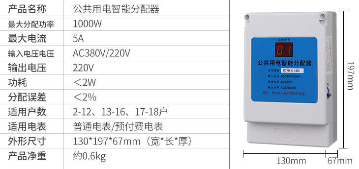 一、智盛牌公共用電智能分配器,是將公共樓道用電所消耗的電能(如樓道燈,對講防盜門等),自動分配到各受益用戶的電表中。每天輪流接通一戶電表,開機(jī)通電時第一戶電表隨機(jī)產(chǎn)生,達(dá)到公平分?jǐn)傠娰M(fèi)的目的,本款公共用電智能分配器的特點(diǎn):外置保險絲更換方便,可實(shí)時顯示均分到哪戶。